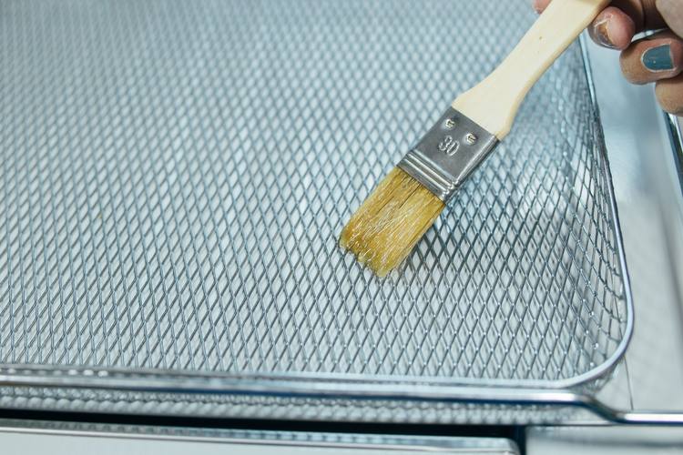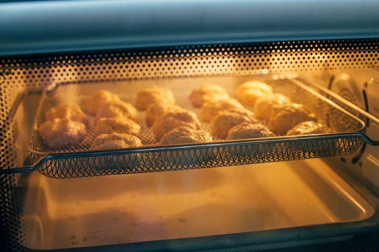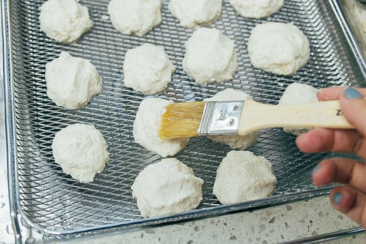 将面糊团成大小均匀的丸子,排入炸网,刷上油。
