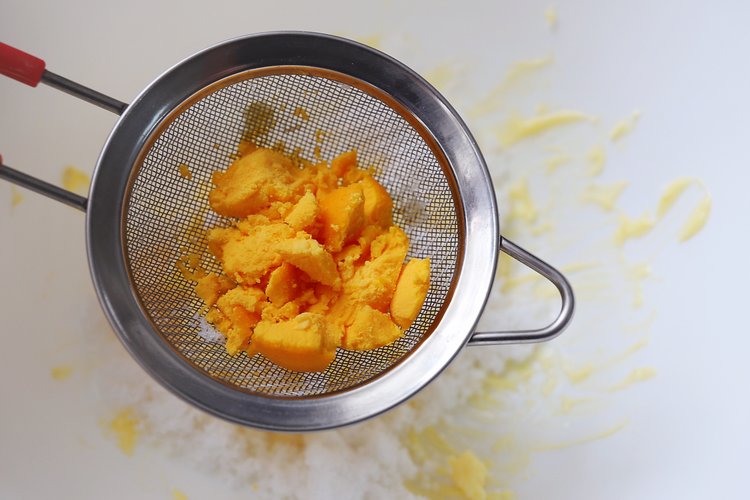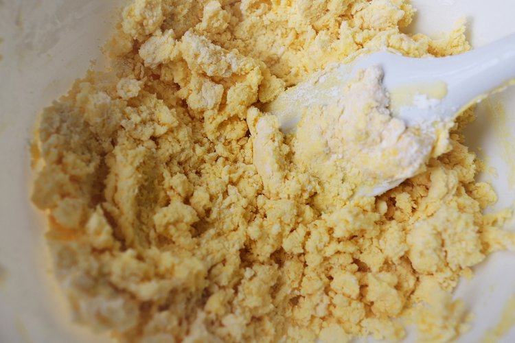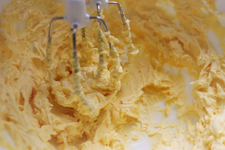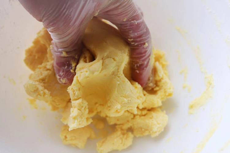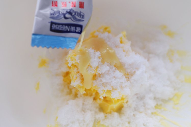 将糖粉和盐过筛黄油中,在挤入10克炼乳。