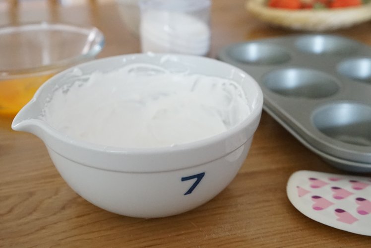 蛋白打发,分三次加入细砂糖,打发到直角不弯勾状态,倒扣不会掉即是打发好。