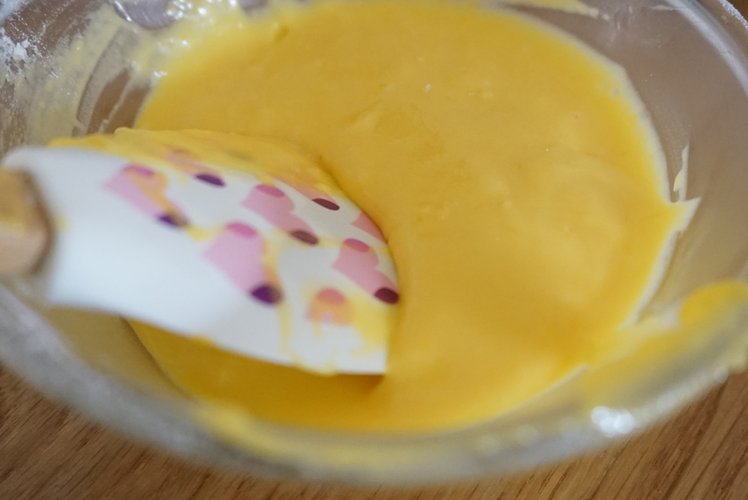 将蛋黄,玉米油,牛奶,细砂糖混合均匀,倒入过筛的低筋面粉混合成面糊备用。然后将三分之一蛋白霜放进混合好的面糊,再次混合均匀,然后将混合好的蛋黄糊再倒入剩下的蛋白霜里,混合好。