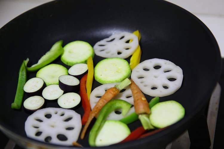 用平底锅小火煎蔬菜,使水分蒸发。小块的蔬菜提前夹出来,不需要全熟,之后还要烤箱烘烤。煎好的蔬菜备用。