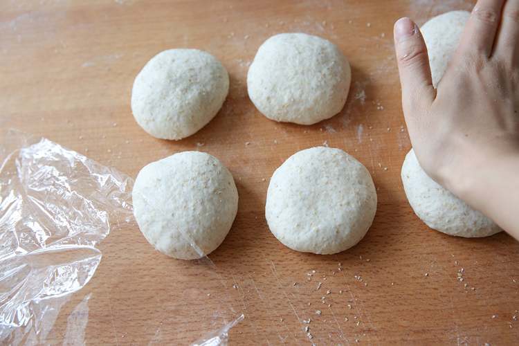 揉圆放置在烤盘上,用手轻轻按压每个小面团。盖上保鲜膜室温发酵40分钟。