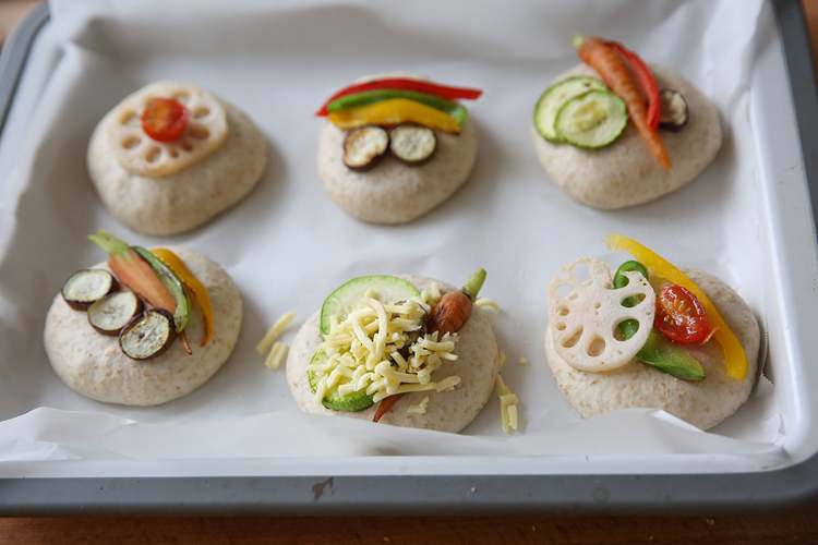 40分钟后依次在扁扁的小面团上摆上各种蔬菜,撒一点点盐,马苏里拉奶酪。烤箱预热190°。