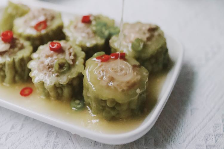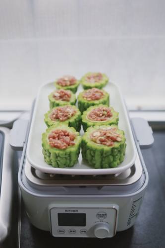 将苦瓜放上蒸炖锅,蒸10分钟。