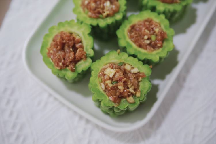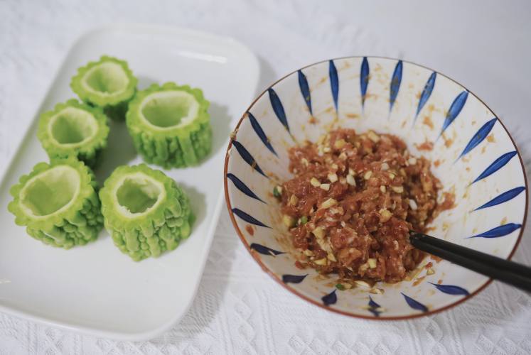 苦瓜切成段去掉瓤,将肉馅塞入苦瓜中,压实。