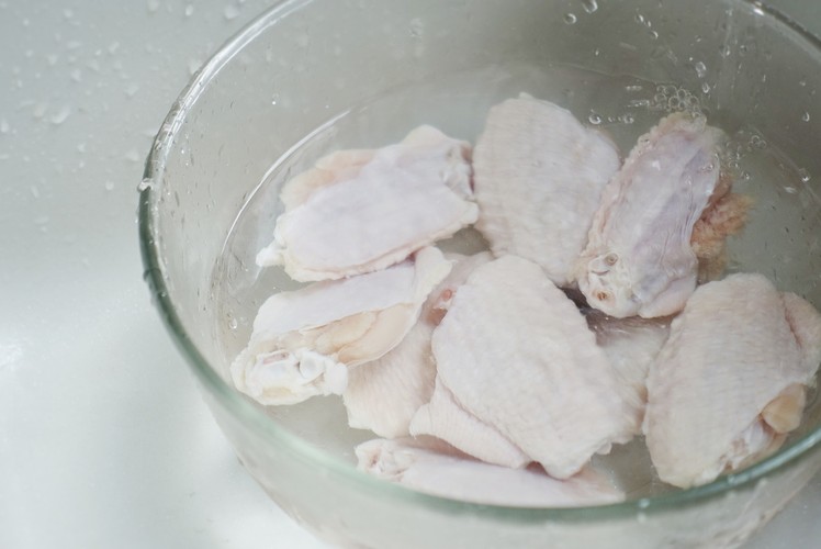 鸡翅用清水把血水冲洗干净,浸泡半小时。