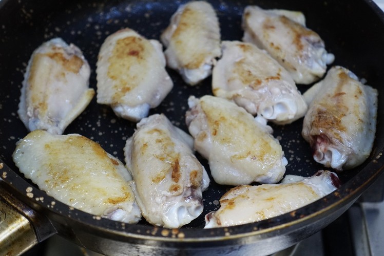 不粘锅烧热,先不放油,把鸡翅一个个放进不粘锅里煎到两面金黄。