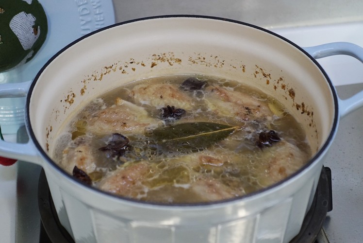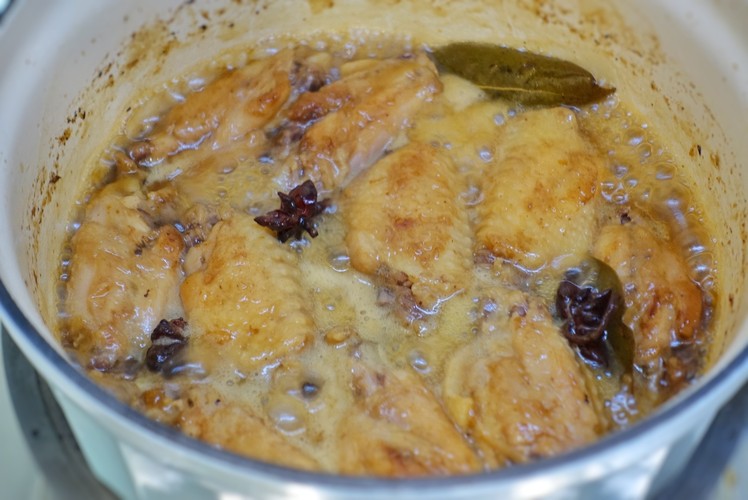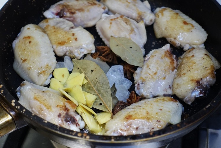 把炒好的鸡翅腾挪到炖锅里,加水没过所有鸡翅。