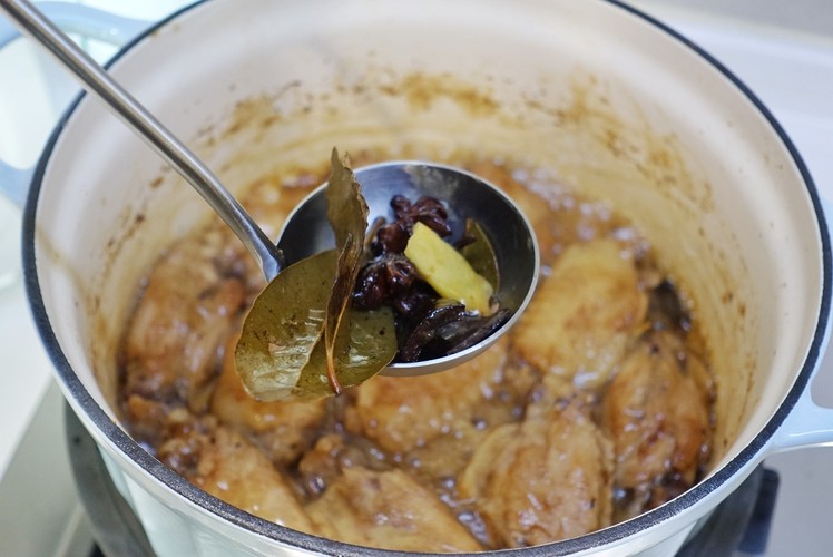 倒入少许食用油,放入姜片、香叶、八角、桂皮、小茴香、冰糖一起翻炒至冰糖基本融化。