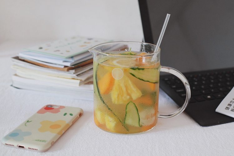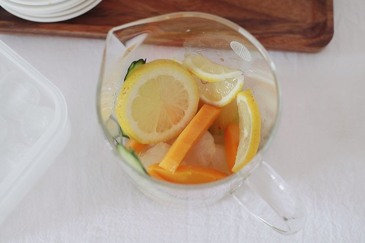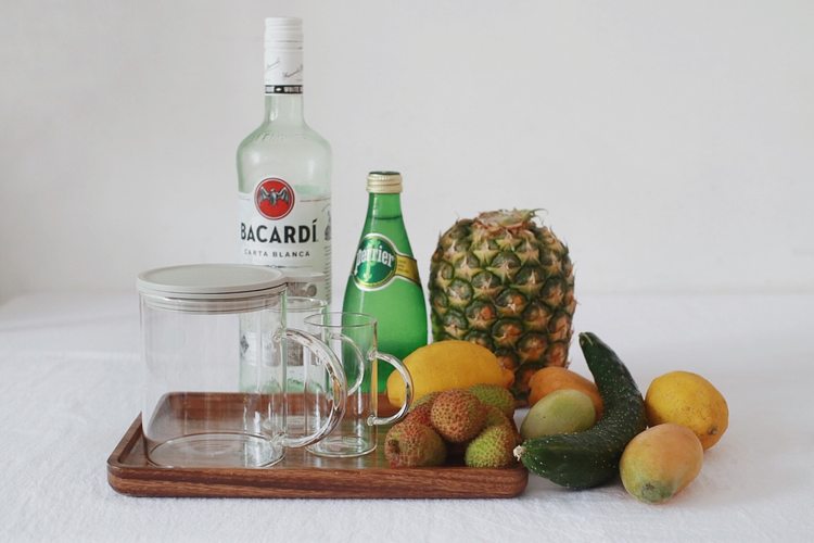 壶里加入30ml朗姆酒,码入青瓜和水果们,用料理棒捣一下捣出果汁。