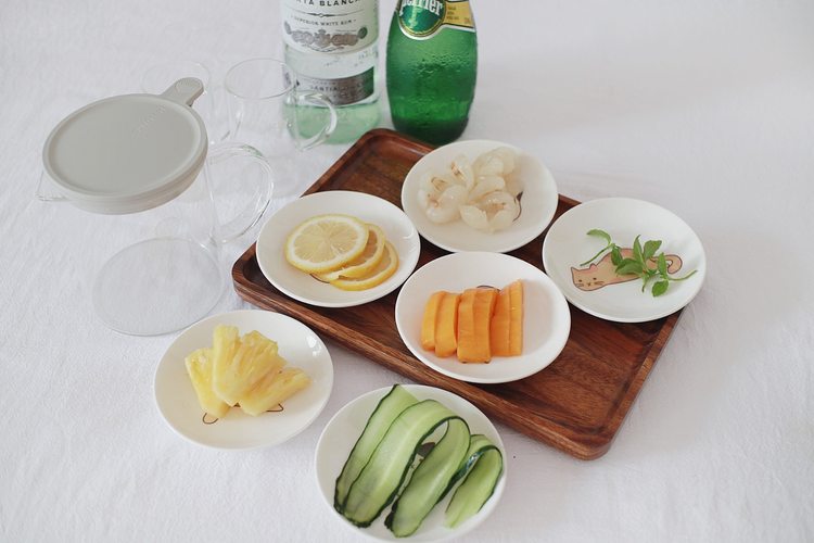 菠萝切块,柠檬切片,荔枝去核,芒果切条,青瓜削片。