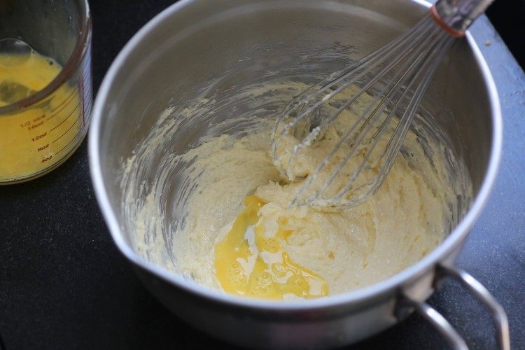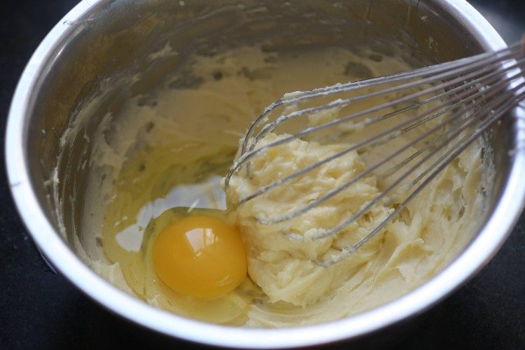 分三次加入蛋液,每次都搅拌至吸收再加下一次,黄油对温度比较敏感,所以鸡蛋选室温下保存的,另外加入香草精搅拌均匀。