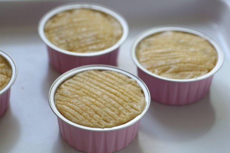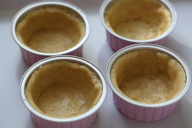 将饼皮面糊在锡纸模具的底部和四壁一圈圈挤满,可以手动按压至贴合模具。