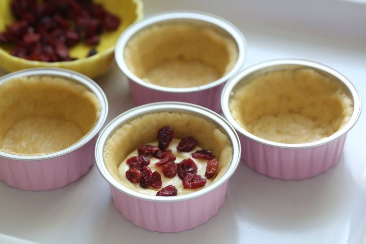 在中间挤入奶酪糊,分两次加几粒泡软的蔓越莓,奶酪糊挤到八分满。奶酪糊是比较浓稠有型的,可以直接在上面挤饼皮面糊封口。