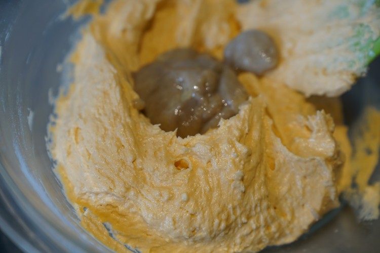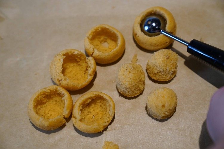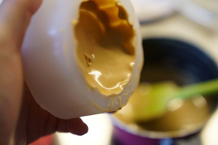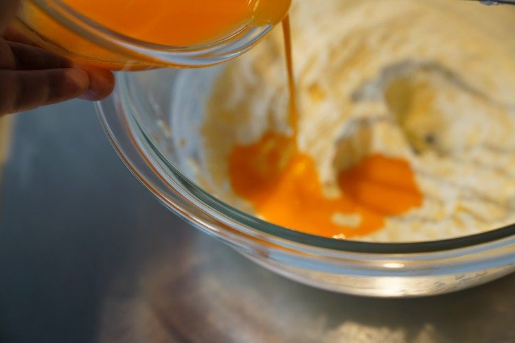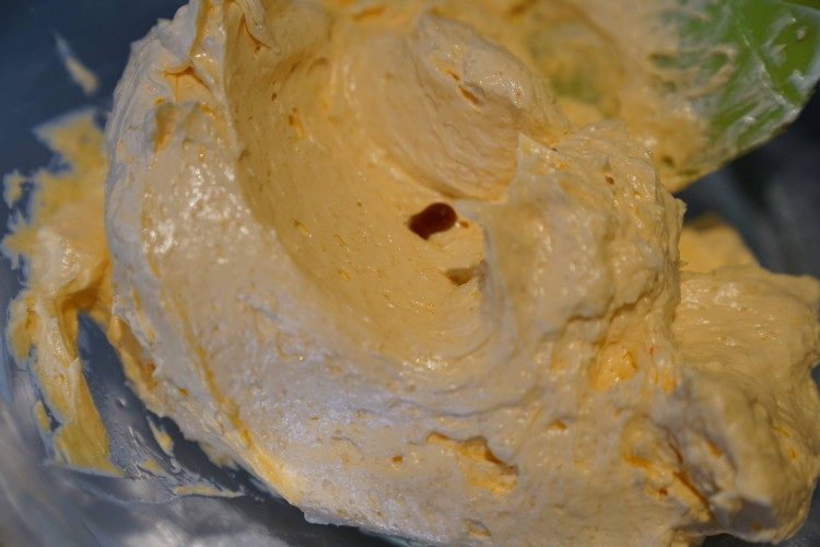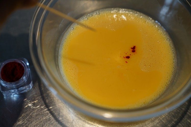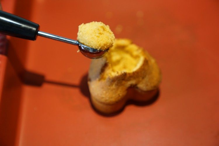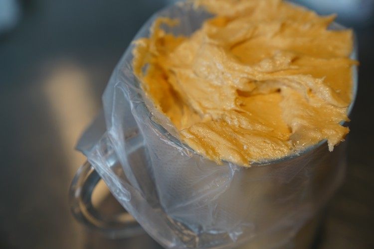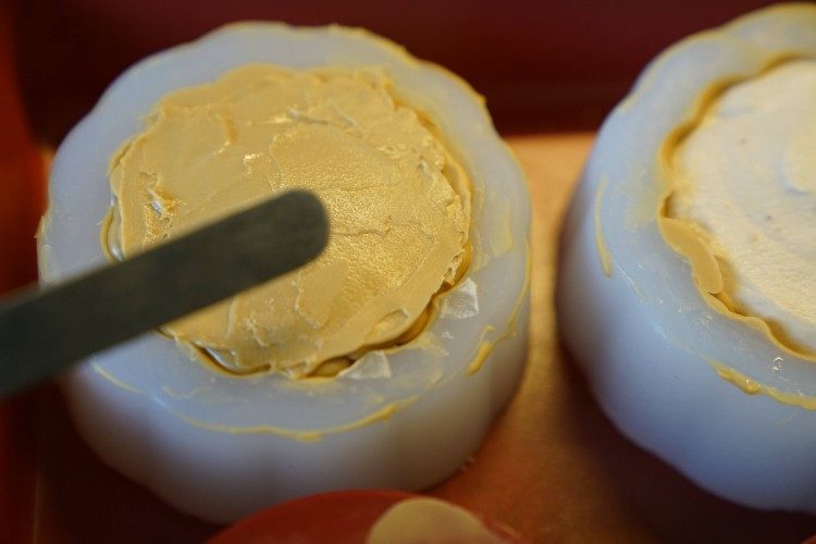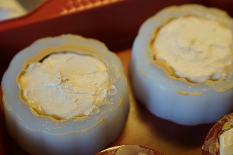 不要轻易用戚风或海绵蛋糕体代替,扎实的蛋糕体才能有蛋黄的错觉。