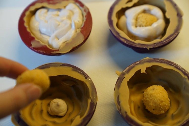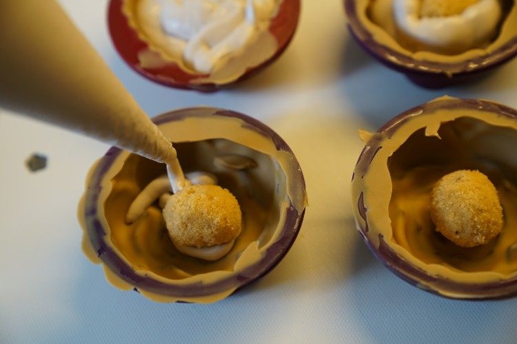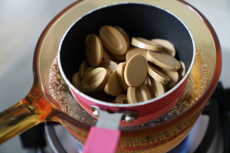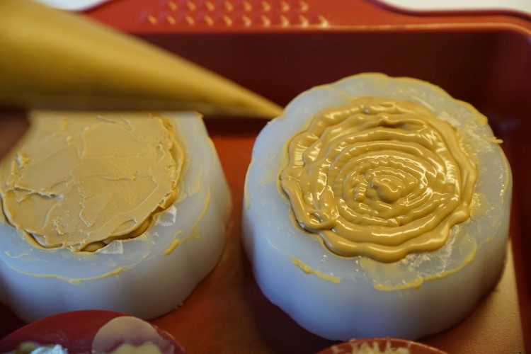 建议用法芙娜度思,金色的巧克力币,与传统月饼相似度更高。乳香口味也与馅料非常搭~