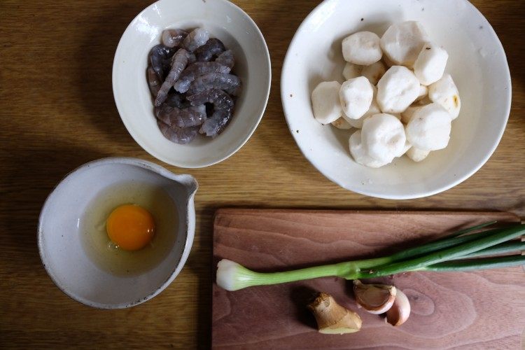 准备好材料后,把鲜虾去壳,荸荠去皮,荸荠用盐水泡一下会好处理一些。