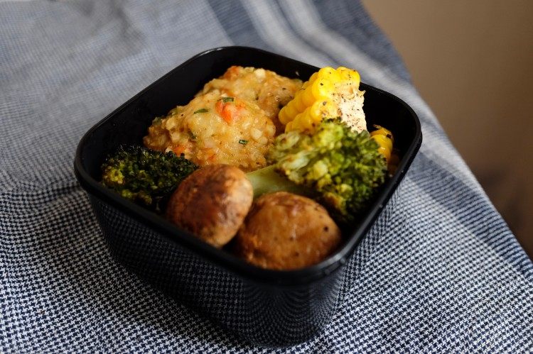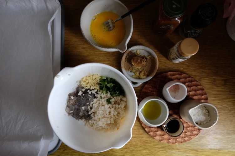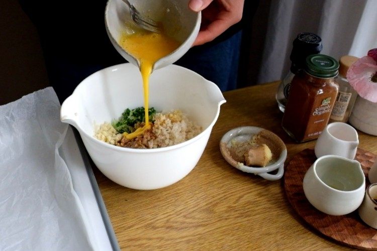 把切好的材料都放进大碗,加入少量的蛋液(大概小个头鸡蛋打散的一半),一大勺橄榄油,2-3勺淀粉,一勺酱油,适量的海盐/胡椒粉/辣椒粉,搅拌均匀。