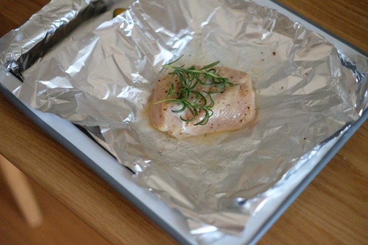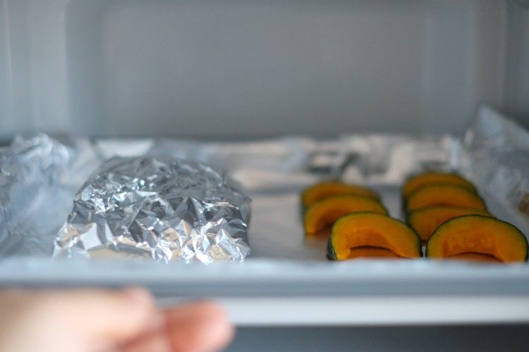 锡纸包好鸡胸肉和南瓜一同入烤箱。