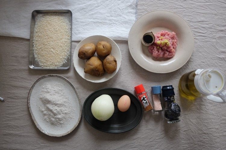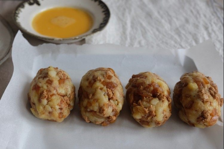 中等大小四只土豆提前蒸熟,洋葱切丁,猪肉剁碎,再擦一撮姜末,备用。