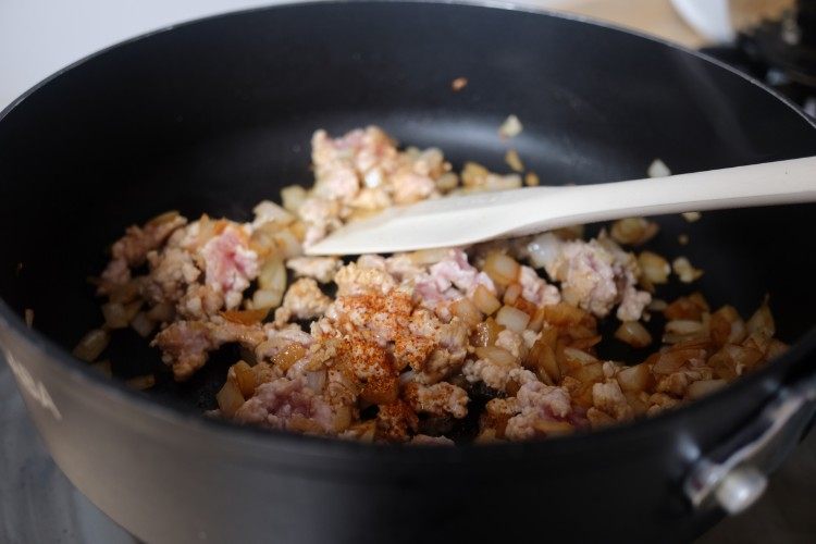 热锅放一勺橄榄油,洋葱丁下到锅里,炒到半透明状,放入猪肉糜和姜末,翻炒片刻加入调味料,一勺酱油/黑胡椒/海盐/七味粉 炒到全熟。