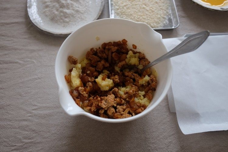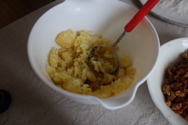 把炒好的洋葱猪肉,放进捣好的土豆里搅拌均匀,这个时候可以尝一下味道,调下味。