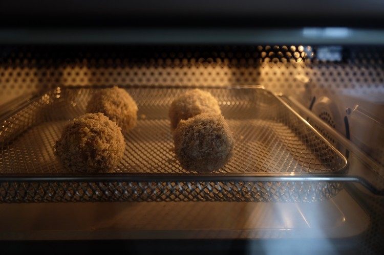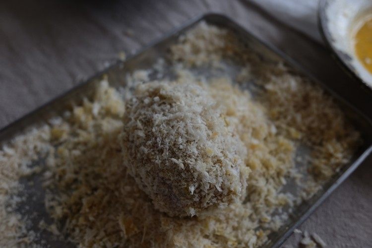 将饼子依次放入面粉裹匀,再放入蛋液碗蘸匀,最后放到面包糠碗内,均匀滚上面包糠。