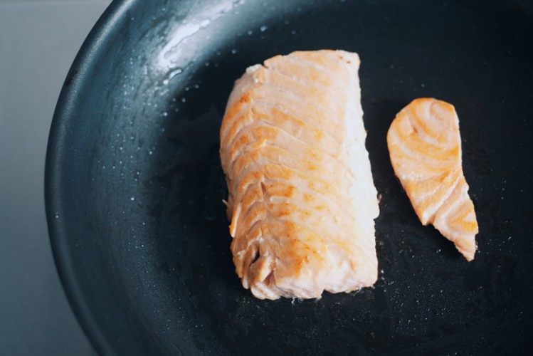 在烘烤前先将三文鱼放入平底锅放入煎至上色,每面适量撒盐,锅内记得刷油。