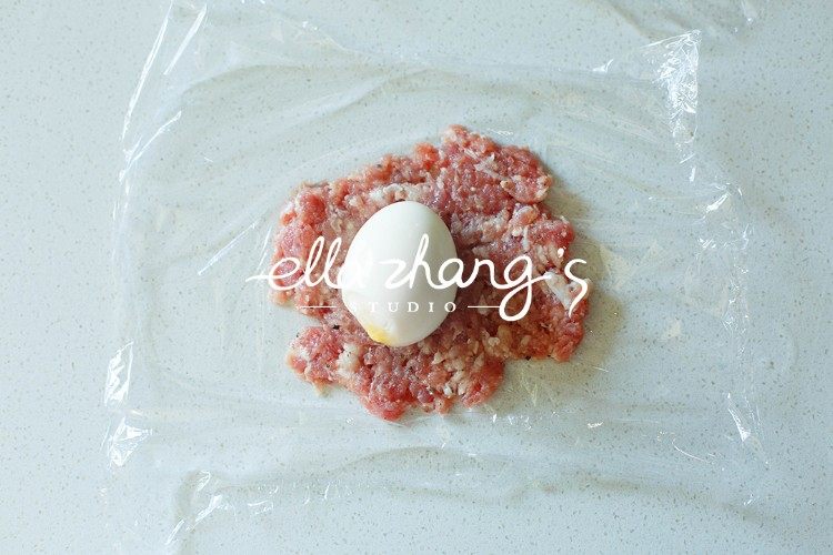 鸡蛋剥壳,肉馅平均分成3份,放到一张保鲜膜上,肉馅尽量摊得大一点。