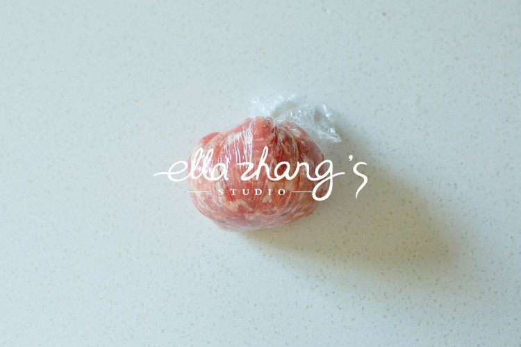 提起保鲜膜,让肉馅包住鸡蛋,收口处收紧。