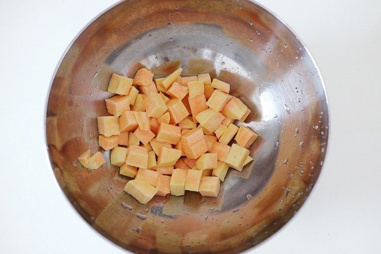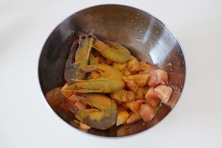 腌制差不多了开始切红薯块,鲜虾去虾线.