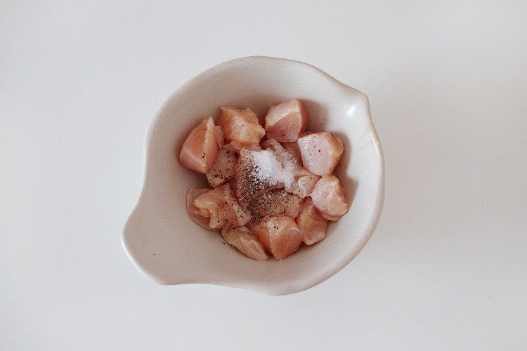 准备好所有食材,鸡胸肉切块与盐酱油黑胡椒碎拌匀腌制15分钟.