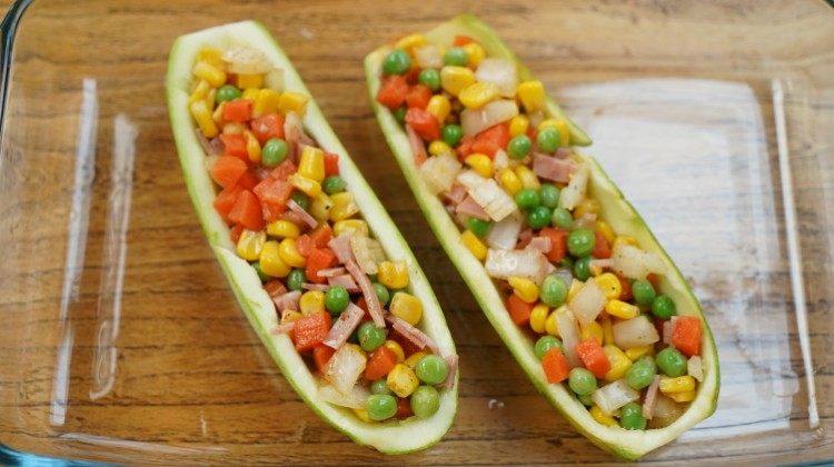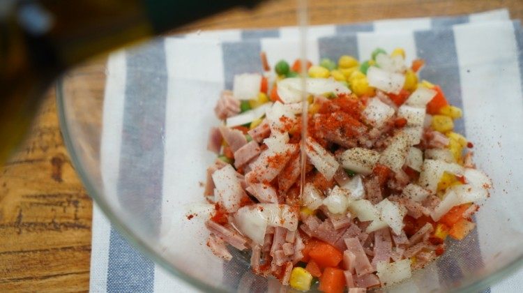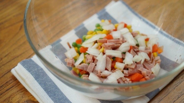 在碗中放入混合蔬菜(玉米、豌豆、胡萝卜),切碎的火腿和洋葱。