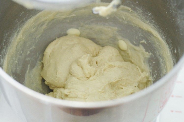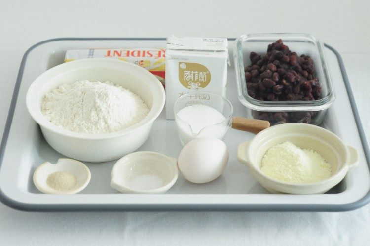 除黄油和蜜红豆外全部加入厨师机搅拌缸,开2档揉至面粉成团,开6~7档揉至光滑。