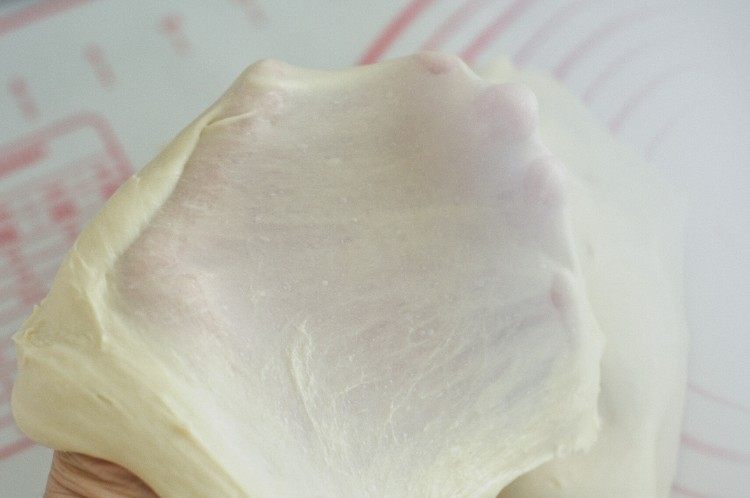 加入软化的黄油,3档至黄油融入面团,7档揉至面团能拉出结实透明的膜。