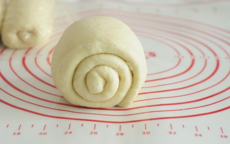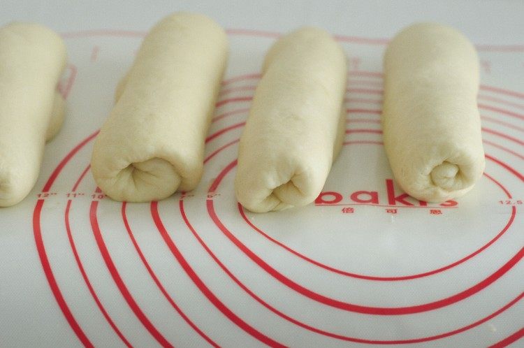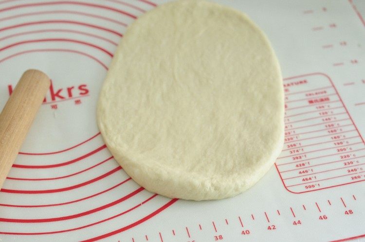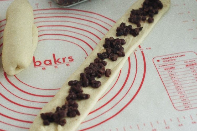 再次取个松弛好的面团擀成长条翻面,撒蜜红豆。