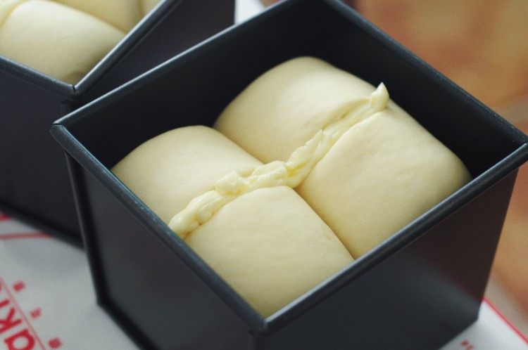 发酵好的吐司用刀轻轻在表面拉一条口子,软化的黄油放入裱花袋,挤在口子上。