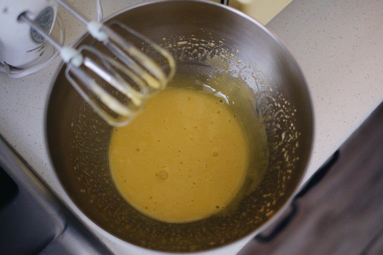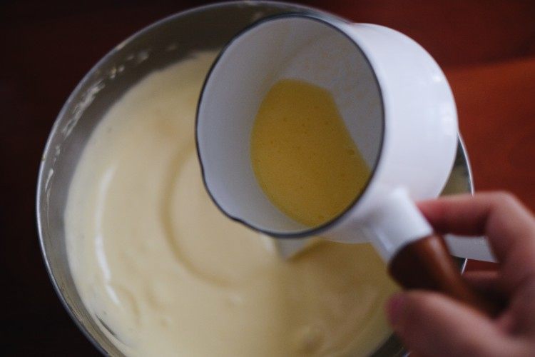 黄油和牛奶加热到50度,分次倒入,边倒边翻拌均匀。