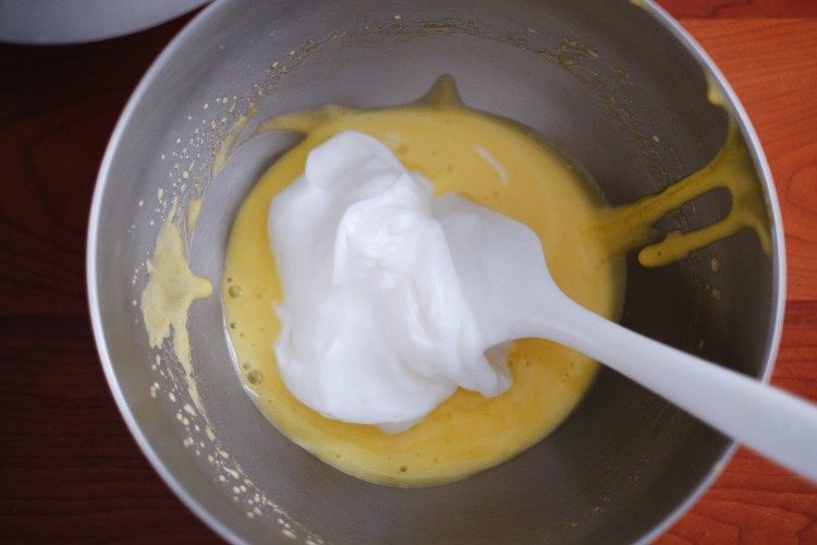 取三分之一的蛋白霜与打发好的蛋黄糊混合均匀,打蛋器从下向上捞起翻拌。