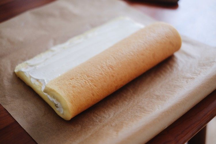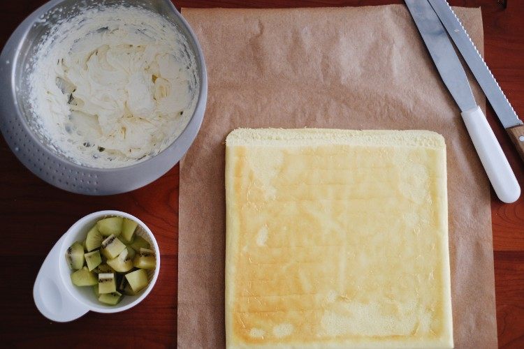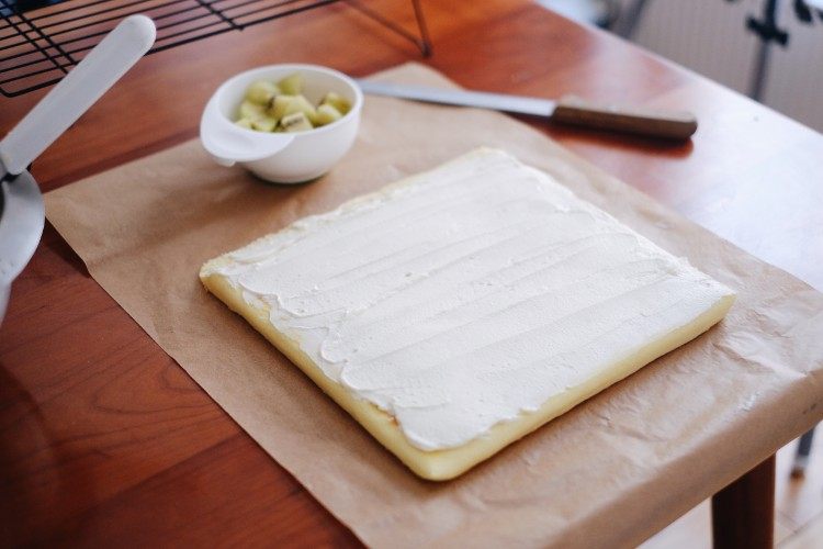 蛋糕胚三分之一处放入喜欢的水果丁,以便卷出好看的卷卷,卷好后水果正好在正中间。