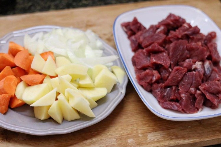 牛肉切小块,胡萝卜、土豆切滚刀块,洋葱切丝。