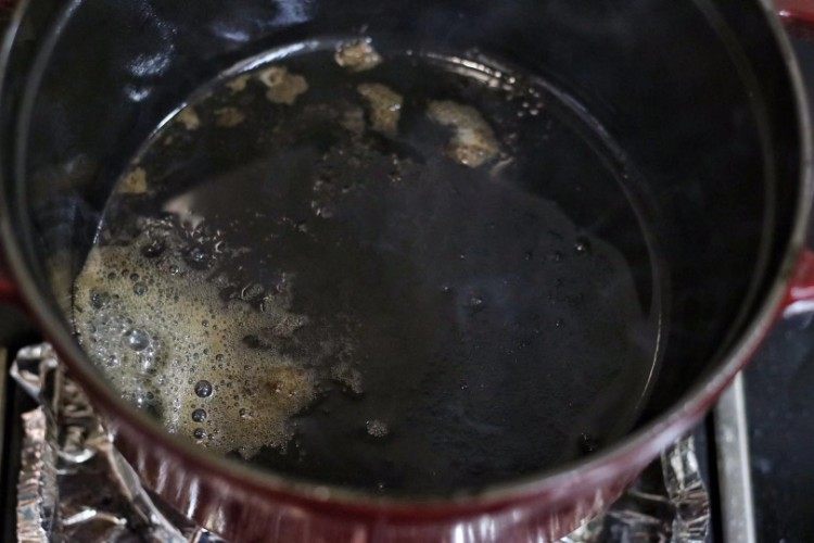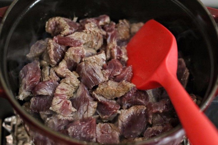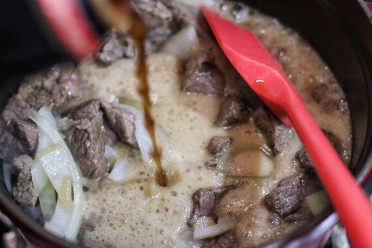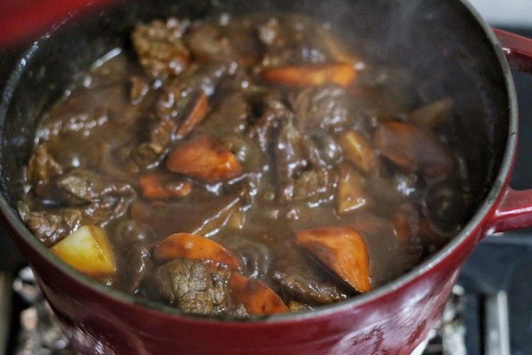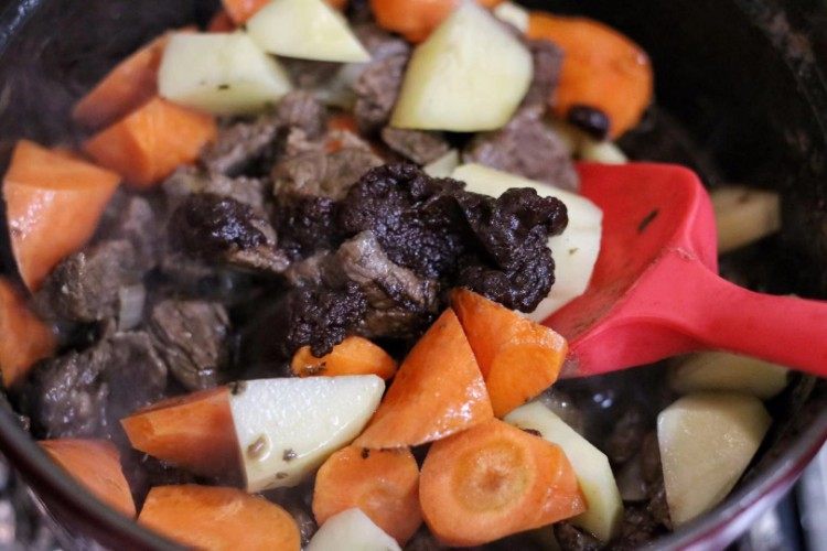 盖盖小火炖煮大约半小时后,加入胡萝卜和土豆块,加入番茄膏,和剩下的黑啤。
