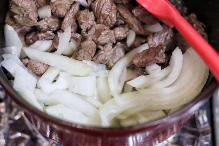 加入洋葱继续翻炒一会儿,闻到香味即可。
