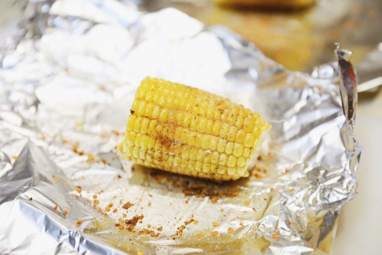 玉米洗净后对切备用,将玉米放在锡纸上,喷一点食用油,将盐巴/辣椒粉/孜然粉/酸梅粉涂抹至玉米表面,尽量涂入玉米缝中(酸梅粉如无可不加)。