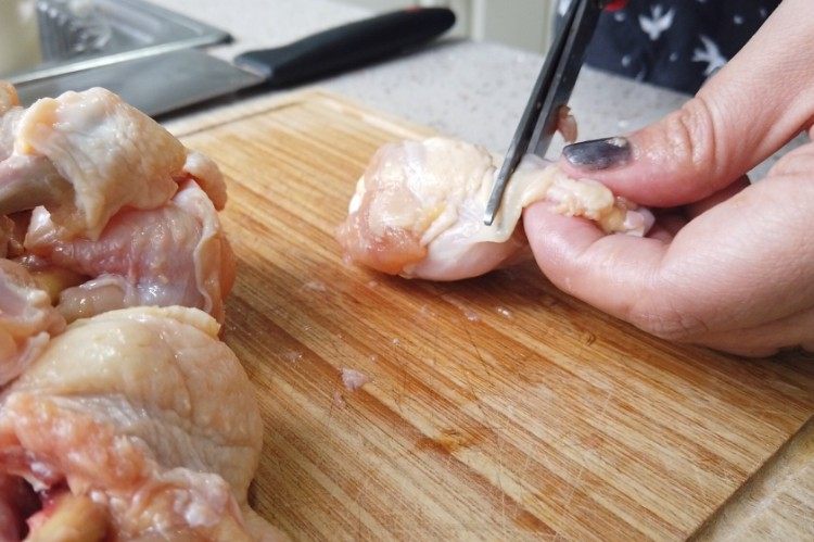 先处理鸡翅根,把翅根底部的肉皮和筋剪断,这样处理更容易入味,造型也好看。