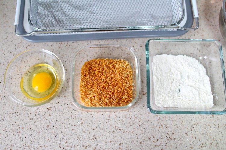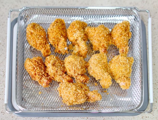 依次将翅根裹面粉-蘸蛋液-滚面包糠,然后放入空气炸网中。