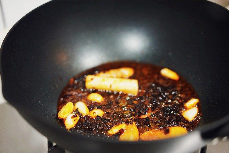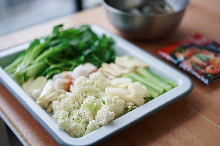 剩余蔬菜依次焯水(绿叶菜除外),起油锅爆香葱姜蒜(能吃辣的还可以放入干辣椒一起炒香),倒入香锅底料炒出香味。