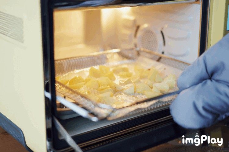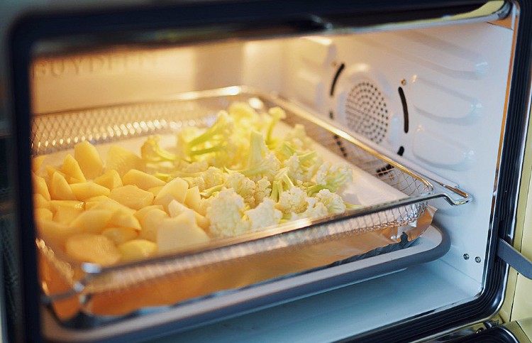 土豆,菜花也淋少许食用油拌匀,放入烤网,依旧选择空气炸功能200度。