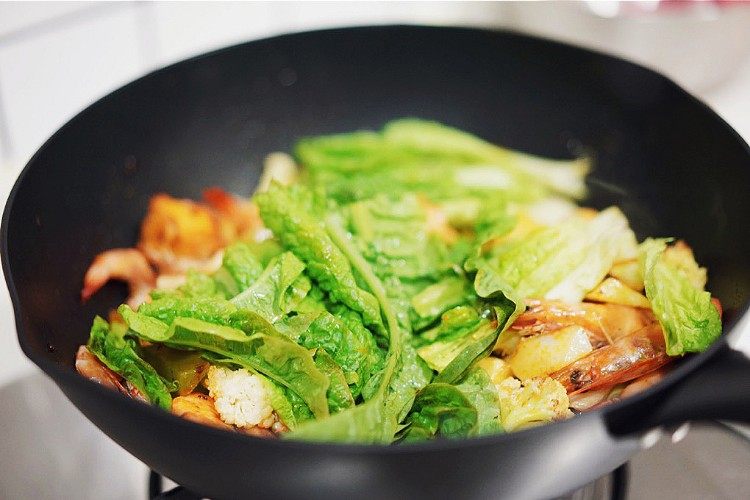 放入之前空气炸制作好的虾,菜花,土豆,各类焯好的蔬菜,翻炒一会,放入绿叶菜,随便翻炒两下关火,余温基本就可以闷熟绿叶菜。