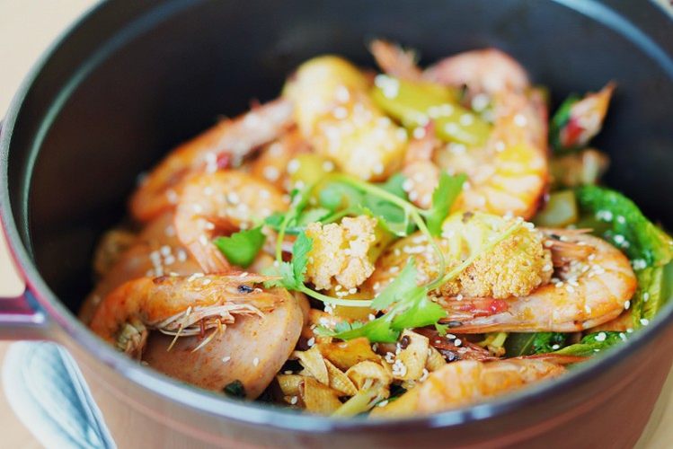 准备各类蔬菜(根据自己喜好),葱姜蒜,香锅底料,大虾洗净去虾线,料酒略腌制一会儿。
